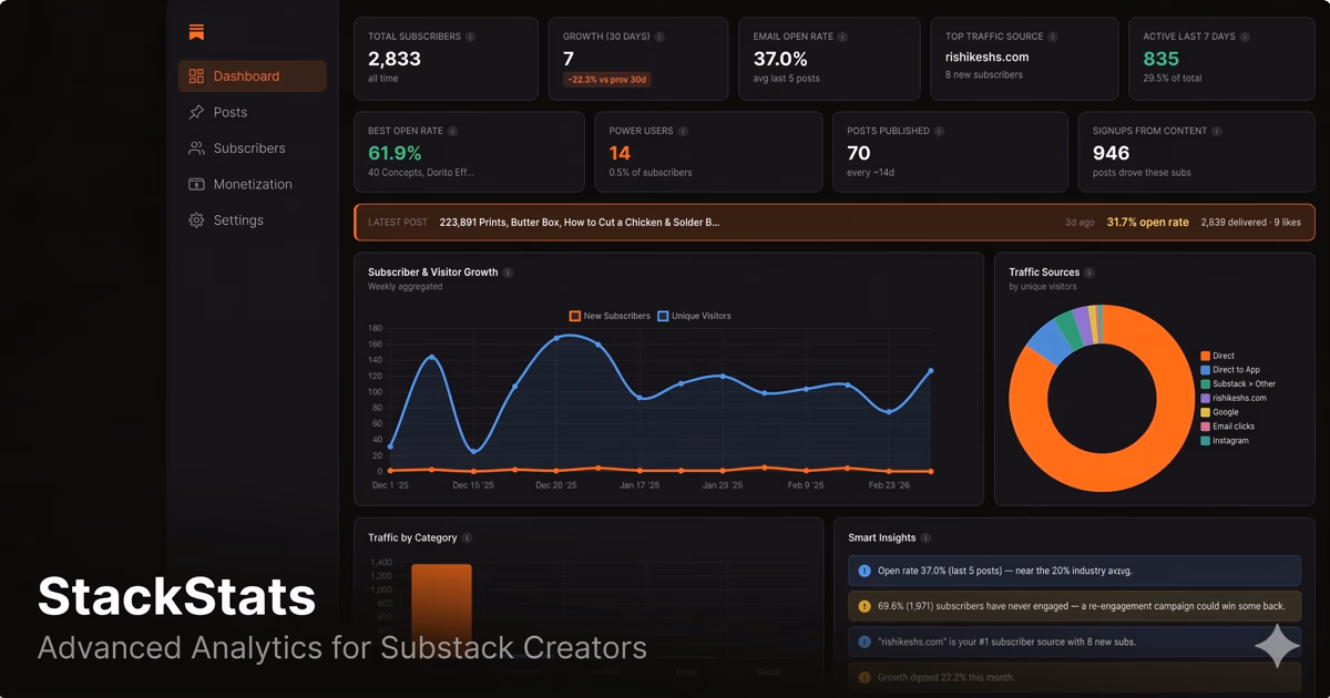 Advanced analytics for Substack writers. See what Substack's dashboard doesn't show you — engagement segments, cohort retention, churn risk scores, superfan detection, content-to-growth correlation, and best time to post. Desktop app. Runs 100% locally. One-time purchase, no subscription.